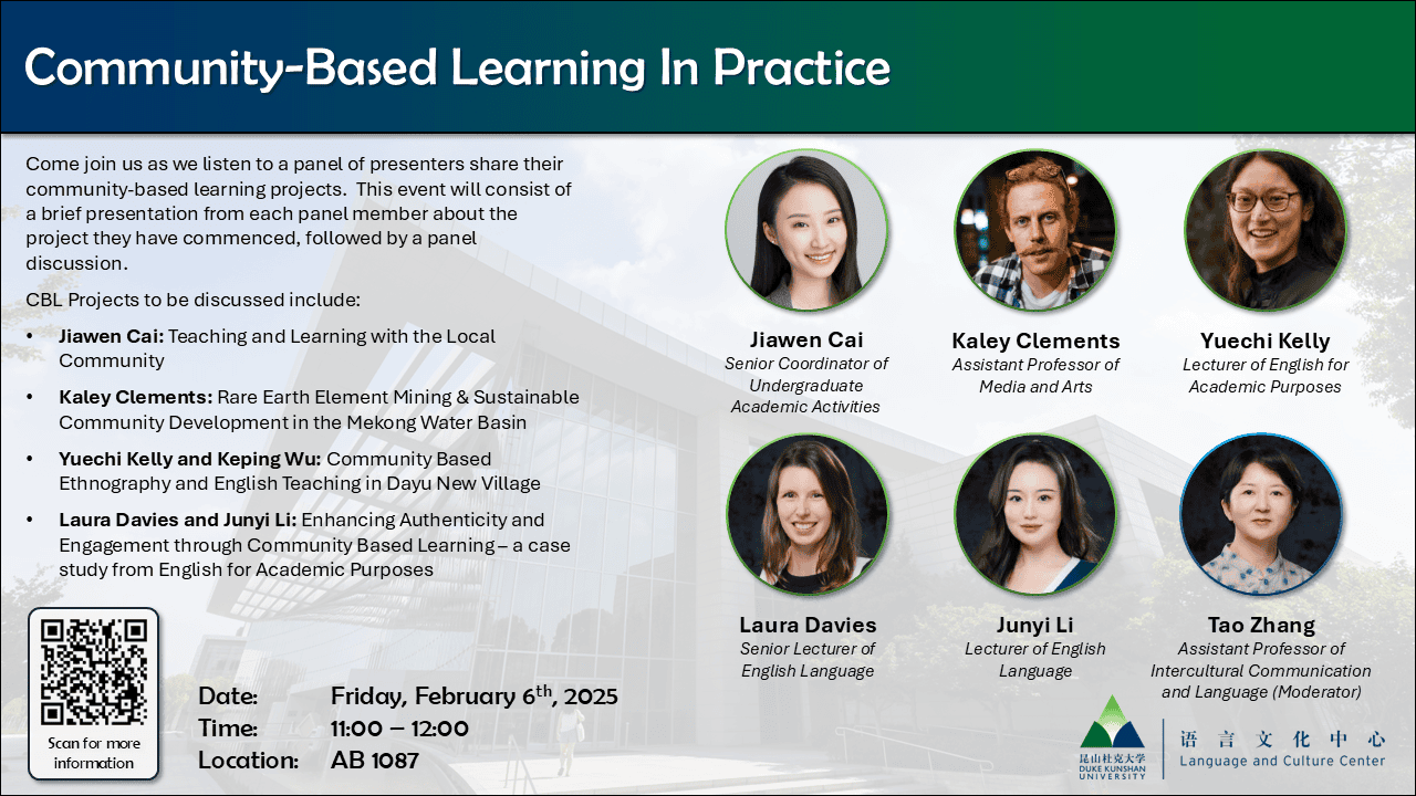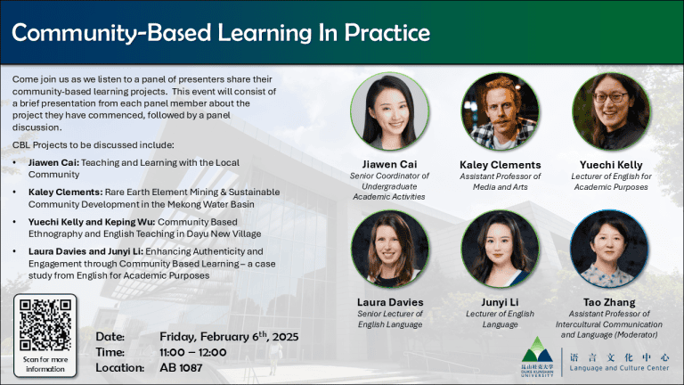Come join us as we listen to a panel of presenters share their community-based learning projects. This event will consist of a brief presentation from each panel member about the project they have commenced, followed by a panel discussion.
