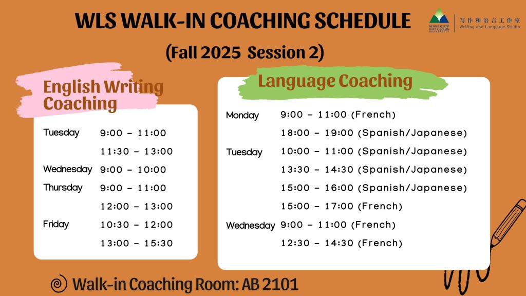 If you weren’t able to make an appointment in advance but would still like to meet with a coach, you may be able to have a walk-in session, depending on coach availability. Please email the WLS (DKU_WLS@dukekunshan.edu.cn) or visit the WLS Coordinator in AB 2101. The WLS Coordinator will direct you to an available coach.